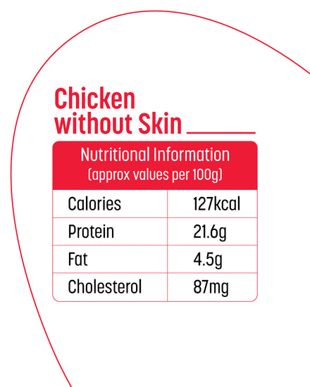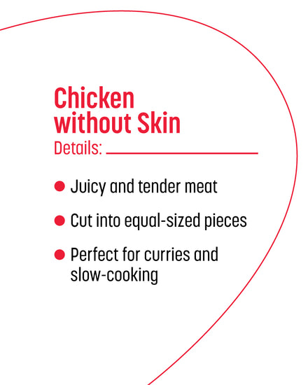"Chicken curry cut without skin is a good source of lean protein, essential for muscle growth and repair. It provides important nutrients like iron and zinc, crucial for immune function and overall health. Without the skin, this cut is lower in fat compared to chicken with skin, making it a lighter option while still offering essential fatty acids and vitamins like B6 and B12, important for metabolism and nervous system health."